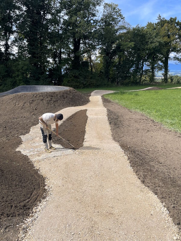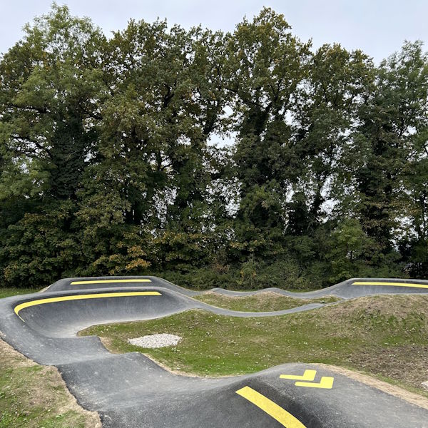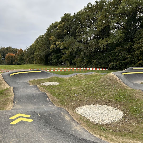 Création d’un Pumptrack avec un revêtement en enrobé bitumineux d’une surface totale d’environ 900 m2. À côté du pumptrack, nous avons également aménagé un parcours d’habileté VTT en revêtement perméable de type skills-center avec notamment une table destiné à l’apprentissage des sauts, des virages relevés, un rock-garden ainsi qu’un module d’équilibre en pierres.
