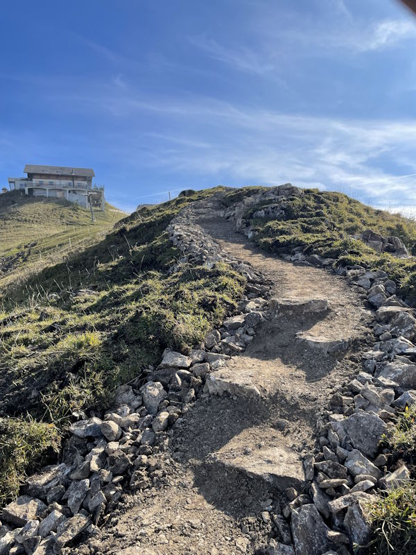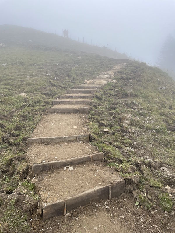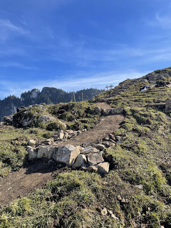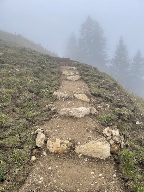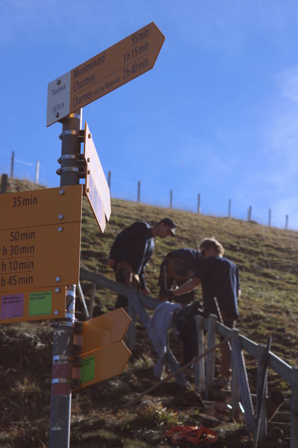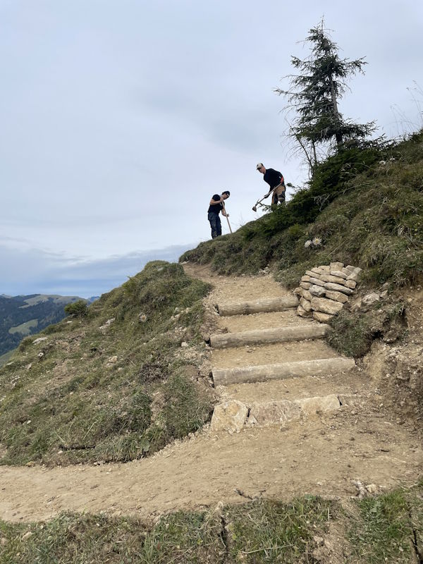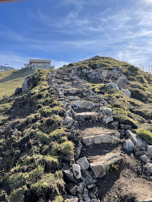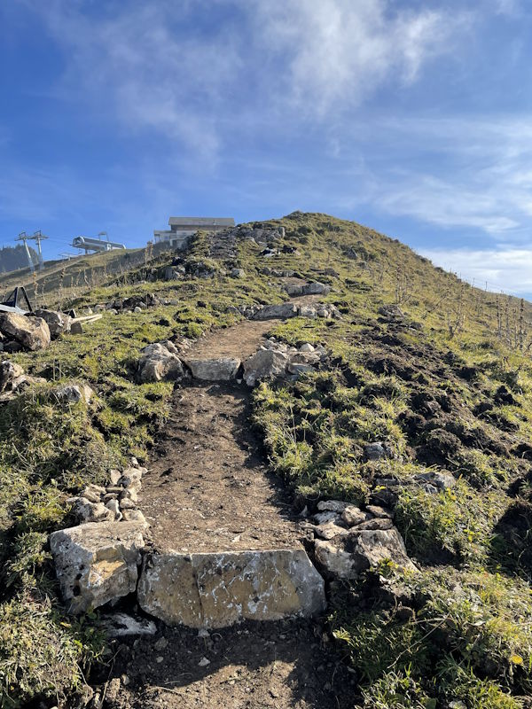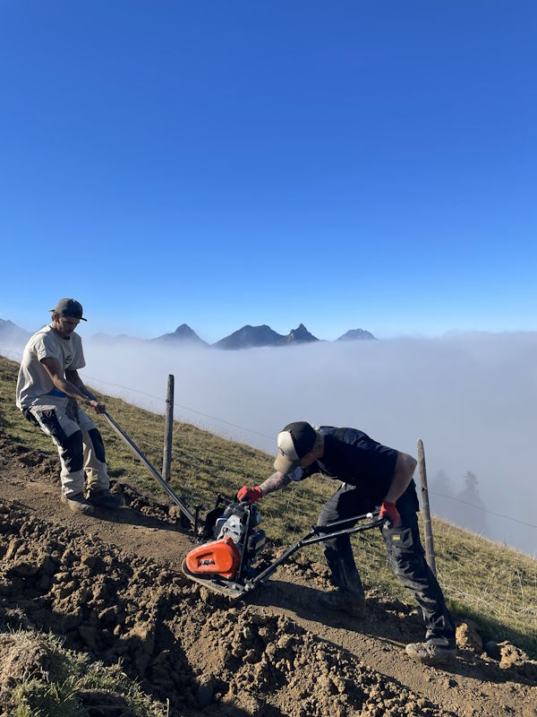 La commune de Val-de-Charmey a mandaté notre entreprise pour la réfection d’un sentier pédestre entre le sommet de Vounetse et l’auberge de Tissiniva. L’itinéraire est situé sur une crête à une altitude de 1500 mètres. C’est une zone pâturée par le bétail avec un sol argileux et très caillouteux. Environ 320 mètres linéaires ont été entièrement reconstruits avec une largeur moyenne de 80 centimètres. Le but de notre intervention a été d’améliorer la qualité du chemin afin de canaliser les randonneurs sur une seule trace et d’éviter qu’ils n’empiètent sur les zones pâturées. Notre équipe a notamment aménagé des marches d’escaliers en pierres entièrement réalisées avec les roches trouvées sur place. Nous avons également modifié un escalier en bois afin d’améliorer la foulée et le rythme de ce dernier.